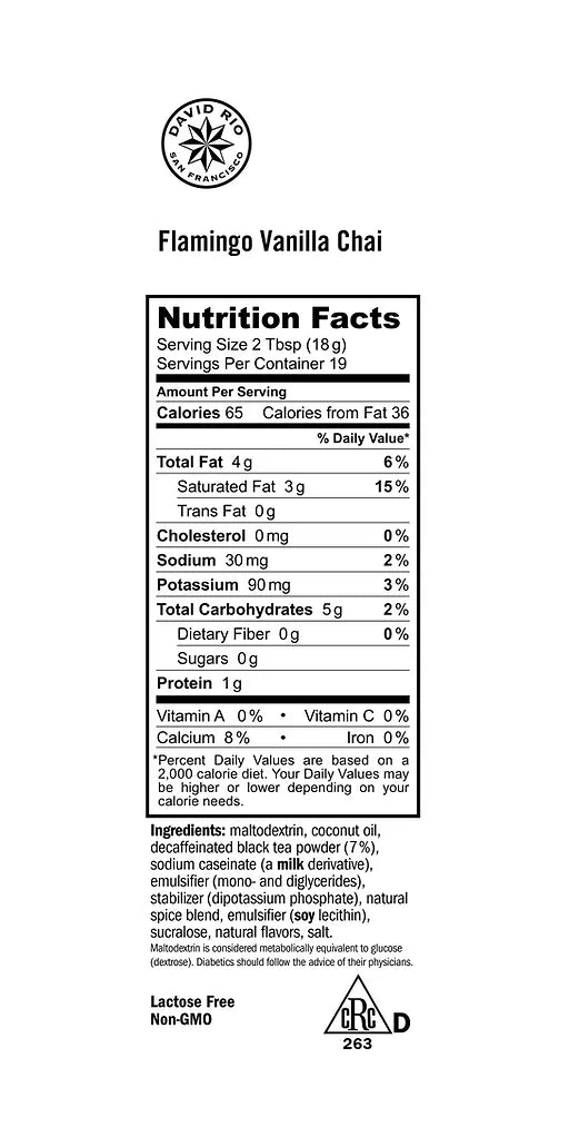David Rio Flamingo Vanilla™ Chai – chai maisījums ar vaniļas garšu bez kofeīna, bez cukura (337 g bundža) 11018