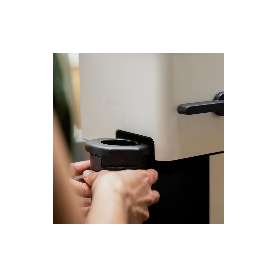 - Piltuvi manuāli ievieto dzirnaviņu fiksatorā, un, pieskaroties displejam, tiek uzsākta kafijas malšana.